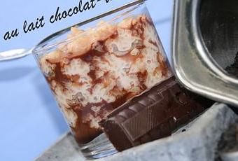 Dans des verrines, répartissez dans le fond un peu de riz au lait, bouchez les trous avec le coulis de chocolat (j’ai utilisé une seringue de 60 ml), répétez l’opération 2 fois encore (3 couches successives).