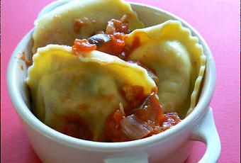 1 paquet de Raviolis aubergines tomates et mozzarela - 1 petite aubergine - 1 boite de tomates en dés - 1 échalote - 1 cuillère à soupe d'huile d'olive - 1 pincée de cumin - Sel et poivre
