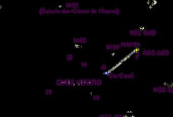 M 51 = la Galaxie des Chiens de Chasse = NGC 5194 est une magnifique galaxie spirale de type Sc, vue de face. De magnitude photographique 8,80, elle possède une petite galaxie satellite de forme irrégulière et de magnitude 10,60, NGC 5195, dans laquelle on a observé une supernova. Distance du couple : 23 millions d'années-lumière. M 51 est en interaction avec plusieurs autres galaxies, dont M 63.