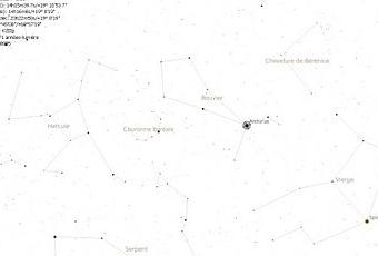 Dès la nuit tombée, Arcturus est la première étoile que l'on aperçoit, haut dans le ciel, parfois avant Vénus. Pour la localiser avec certitude, attendez l'apparition de la Grande Ourse, puis prolongez le montant du chariot vers le sud tout en décrivant un léger arc de cercle.