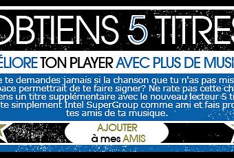Tu as bien sur plein de chanson à metrre sur Myspace malheureusement tu dois faire le choix de 4 chansons pour le player myspace, mais grace à Intelpowersmusic tu vas pouvoir débloqué cette 5ème pyste et ainsi proposer une musique suplémentaire sur ton espace.Pour cela il suffit de devenir l’amis de Intelpowersmusic et de l’ajouter à tes amis. Intel sponsorise une excelente idée.