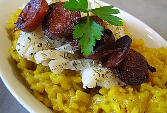 - Servir le risotto bien chaud avec le cabillaud et les tranches de chorizo.