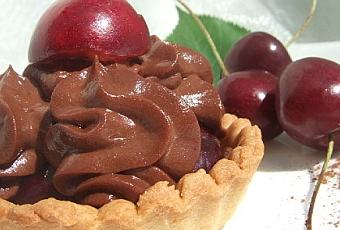 Déposer uu petit peu de cette crème sur chaque fond de tartelette. Poser par-dessus 4 demi-cerises dénoyautées et finir de décorer avec la mousse mascarpone à l’aide d’une poche à douille (douille cannelée).
