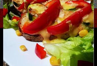 Maintenant c'est courant de trouver des tartines en entrée dans les restaurants, donc je m'y met également et je vous propose ces tartines aux courgettes, poivron rouge recouvertes d'époisses au marc, un fromage qui vient de la fromagerie Xavier [je vous invite à aller visiter leur site ici]. Résultats : c'est très bon avec une salade, en bouche, le fromage prend le dessus, puis ensuite vient le goût du poivron et de la courgette, très bon.