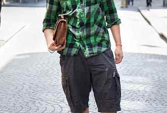 Parfois l'accessoire fait beaucoup pour un look. C'est le cas de Xavier Paul qui fait contraster une allure très casual (on notera quand même le soucis du détail avec les baskets qui matchent la couleur de la chemise !) avec une mallette vieille de plus de 80 ans.