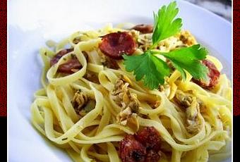 Lorsque j'ai rencontré Louise aux Etats-Unis, en octobre 2007, celle-ci avait eu la gentillesse de m'offrir un livre de Daniel Pinard, chroniqueur culinaire et célèbre présentateur de programmes de la spécialité à la télévision québecquoise. Le chapitre intitulé - dans le texte - "O Portugal do meu coração" [le Portugal de mon coeur] m'avait immédiatement interpellée, forcément. L'auteur y parle joliment de ses amitiés au sein de la communauté portugaise de Montréal et donne quelques recettes glanées auprès de cuisiniers professionnels ou amateurs, ou encore d'autres qui lui ont été inspirées par des produits typiques que l'on trouve facilement au Canada, comme le chouriço [le chorizo portugais], par exemple. La recette présentée ci-dessous fait partie de cette dernière catégorie. Ce plat de pâtes, avec son mélange terre-mer dans l'esprit de la carne alentejana rappelle indubitablement le Portugal. Et pourtant, l'utilisation des "bottled baby clams" nous ramène en Amérique du Nord. Il s'agit indubitablement d'un plat de cuisine luso-américaine, comme j'ai déjà eu l'occasion d'en manger dans des restaurants portugais de Rhode Island comme celui-ci, où la famille américaine de mon mari nous avait invités à déjeuner par un dimanche ensoleillé. Il est toujours intéressant et amusant pour un Portugais de voir comment sa cuisine évolue lorsqu'elle est transplantée en dehors de son pays d'origine. Au Portugal, il serait impensable d'utiliser des clams en boîte - on y est trop pointilleux sur la qualité des fruits de mer, et je crois que mises à part quelques boîtes de moules à l'escabèche importées d'Espagne, on n'en trouve même pas à la vente dans les supermarchés. Mais comme j'habite à Terceira et que nous y disposons d'épiceries américaines - base aérienne militaire oblige, j'avais justement de ces "bottled baby clams" de marque Geisha dans le placard, achetées par pure curiosié - et parce que je trouvais la boîte jolie et exotique, j'avoue. Aussi, je me suis laissée tenter à tester ces pâtes "à la portugaise" tellement américaines et, franchement, je n'ai pas trouvé ça mauvais du tout, bien au contraire. J'essaierai tout de même de refaire la recette avec des palourdes ou des coques fraîches...