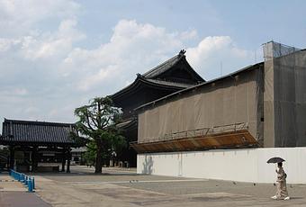 Ainsi, cette femme en kimono gris s’apprête-t-elle à traverser la cour du temple en réparation de Hongan ji dans le quartier de la gare à Kyoto. La chaleur est lourde et orageuse, elle se protège du soleil avec une ombrelle, ce qui est très courant au Japon. Me voyant sortir mon appareil photo, elle a pressé le pas.