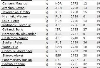 Le n°1 français Etienne Bacrot (2721) perd 7 petits points sur un trimestre et pointe en 17ème position.