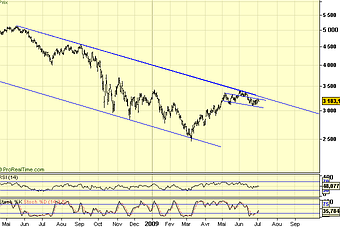 Le biais haussier mentionné la veille a déjà fait long feu. Les indicateurs américains ont clôturé modestement en hausse et les chiffres du chômage sont attendus exceptionnellement aujourd'hui compte tenu de la fête nationale américaine. C'est moins le contenu macroéconomique qui importe au marché que le déclencheur que ces chiffres peuvent constituer en cas de surprise. Pour l'heure, le sentiment est à un ralentissement des destructions d'emplois et nous verrons bien ce que le marché décidera de faire de la statistique. Techniquement, rien de fondamentalement changé même si la formation en tête épaules prend un peu plus forme chaque jour et notamment avec la reprise d'hier où l'on a vu l'indice se hisser en direction de 3240 sans toutefois parvenir à les déborder. Nous conservons le solde de notre position à la vente avec un premier objectif à 3130 mais surtout un second à 3100/3090 pour se racheter sachant que la rupture de 3100 propulserait l'indice vers 3025/3000 qui est pour l'instant le bas du canal. Les indicateurs quantitatifs pointent de nouveau à la baisse et comme suggéré dans nos dernières notes nous pensons bien que ce n'est qu'une question de temps pour regagner 3000 qui sera alors le grand rendez-vous.