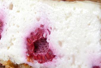 Déposez le second rectangle (ou cercle) de dacquoise sur la mousse et décorez de framboises.