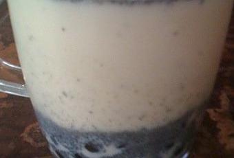 Mon Bubble Tea : Lait de Soja Bio au sésame noir - une tuerie !! Au fond, ce sont les perles de tapioca. Quoique les miennes, on aurait plutôt dit des perles à base de farine de riz et d’herbe (comme la gelée d’herbe en fait)