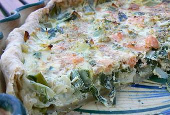 Ingrédients : 1 pâte brisée - 1 kilo de poireaux émincés - 1 barquette de dés de saumon fumés (Labeyrie, trouvés en Grande surface) - 4 œufs - 20 cl de crème liquide (légère ou non) - Poivre - 2 cuillères à soupe de gomasio.