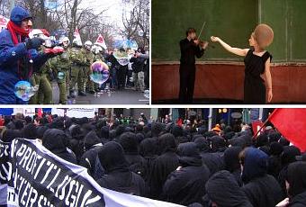 Journée grand écart. Sur Alexander Platz un clown fait des bulles entre les autonomes et les flics. La manif anti-crise berlinoise se finit en mini-émeute sous la pluie. Presque un rituel. Capuches noires contre rambos verts. Les flics sont en tenue de guerre. Ce sont eux qui chargent, qui cherchent, qui trouvent. Quelques heures plus tard, à quelque pas de là, le monde se fait beau. Sasha Waltz joue les magiciennes au Neue Museum. Intense moment de beauté. Drôle de journée.