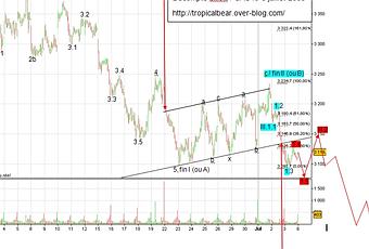 Ce décompte serait totalement invalidé au dessus de 3235, mais un franchissement confirmé en clôture de la résistance oblique formée par le bas du drapeau de la fin juin (3150) diminuerait déjà sa probabilité.