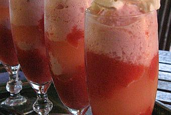 Disposer une couche de purée de fraises dans le fond de chaque flute puis une boule de glace fraise, verser un peu de Schweppes sur la boule de glace, terminer par un nuage de chantilly maison,