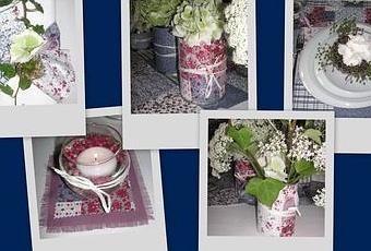 Une table d'été, simple, avec un morceau de tissu, quelques boîtes de conserves, ainsi que quelques fleurs de jardin !