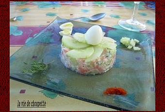 Emincer finement le tronçon de concombre restant, couper les tranches en 2 et décorer le tartare.