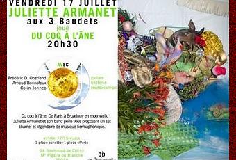 Fidèle à l'idée que je me fais de notre site, et pour faire profiter à certains de notre renommée internationale, voici un petit message totalement amical et emprunt de copinage. Pour la première fois sur scène avec un groupe, Juliette Armanet - par ailleurs documentariste émérite - foulera les planches mythiques de la salle des Trois Baudets, à Pigalle, le 17 juillet prochain. Dans ce lieu qui a accueilli bon nombre de grands noms de la chanson française lors de leurs débuts (Gainsbourg, Vian, Brel entres autres...), la jeune femme y déroulera un répertoire axé chanson - c'est la tradition aux 3B - accompagnée d'un backing band en forme de triplette (guitare, batterie, feedback/mpc). Au programme de la musique hermaphonique - ne me demandez pas de vous expliquer - et une découverte à faire pour les amateurs de douces mélopées. Entrée 12/15€ (1 place achetée - 1 place offerte)Le site web des Trois Baudets.