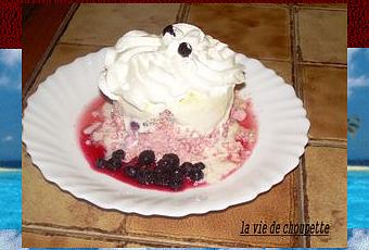 Démoulez les vacherins. Décorez de crème chantilly, de myrtilles, d'un peu de crème de fraises et servir aussitôt.