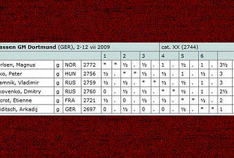 La 37ème édition du traditionnel tournoi d'échecs allemand de Dortmund se déroule du 2 au 12 juillet. Début aujourd'hui des matchs "retour" avec une avance au classement pour le champion d'échecs norvégien Magnus Carlsen à 3,5/5. Mais attention, Vladimir Kramnik qui affronte Peter Leko est à une demi-longueur...