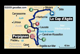 La 5eme étape de ce Tour de France, longue de 196,5 kilomètres, va partir du Cap d’Agde puis traverser les départements de l’Hérault, de l’Aude pour arriver dans les Pyrénées-Orientales, à Perpignan.