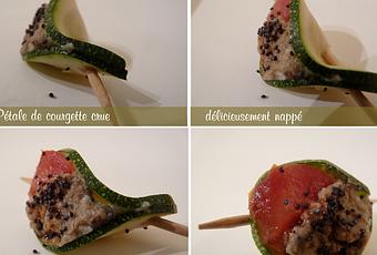 4 - Disposer un petit carré de tomate et à l’aide d’un pic refermer le pétale dans une sorte de petit cornet.