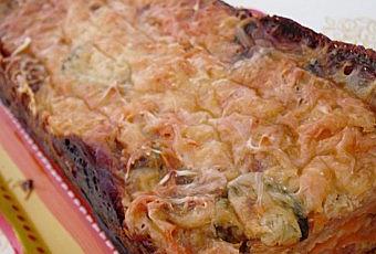 Verser la moitié de la préparation dans un moule à cake beurré. Couper le camembert en morceaux et le répartir dans le moule. Verser l'autre moitié de la préparation, parsemer de gruyère, enfourner pour 40 minutes.