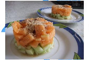 Coupez le melon et le concombre en petits dés et mettez ces derniers dans un bol avec un peu de sel pour ôtez le maximum d'eau.