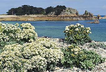 Ci-dessus, des crambes maritimes en fleur sur le cordon de galets entre les îlesBalanec, Ozac’h et Illiec.