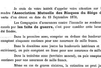 Je crois de votre intérêt d’appeler votre attention sur les services que peut rendre l’Association Mutuelle des Risques du Siége de Paris, fondée en vertu d’un décret en date du 15 Septembre 1870.