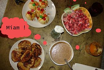 Pommes au four caraméliséesEpluchez les pommes et retirer le milieu avec un couteau.Placez-les dans un plat à four, saupoudrez de sucre roux et déposez une noisette de beurre sur chaque pomme.Mettez au four th.6 (180°) 30 à 40 minutes.Quand les pommes sont cuites, versez le caramel du fond du plat au dessus.Juste pour le plaisir, j'ai ajouté des dragibus géants !Ca me rappelle mon enfance...Salade de fruits et légume(s)1/2 concombre2 pommes Granny Smith300 grs de Framboises surgelées (bio)Une poignée d'amandesLait de cocoSucre rouxPour changer des salades de fruits traditionnelles, j'ai voulu essayer d'y mélanger un demi concombre. Je l'ai coupé en petits dés comme les pommes, et j'y ai ajouté les framboises et le lait de coco. J'ai pillé les amandes au pillon en bois (c'est du sport...), et les ai fait caraméliser avec le sucre roux.Le résultat est frais, acide et légèrement sucré en même temps... et puis ça fait une salade toute rose !Brioche perdueVous connaissez sûrement tous la recette du pain ou de la brioche perdue... On mélange un oeuf battu, du lait et du sucre. On en imprègne les tranches de pain ou de brioche et on fait revenir dans une poêle.J'ai fait la brioche avec une préparation en sachet, et même si le résultat n'était pas mauvais, je n'en suis pas très satisfaite. La brioche n'a pas levé, elle est trop compacte. La prochaine j'essaierai une recette 100% maison.Pâte à tartiner aux SpéculoosJ'en avais déjà parler il y a quelques mois, vous pouvez trouver ma recette (simplissime) ici. Et je suis plutôt contente, La Fée, qui a goûté la recette du commerce, a trouvé la mienne meilleure, hi hi !Voilà le résultat quelques minutes plus tard... ou presque !