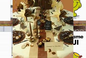 - Lui : …JE TE PARLE DE TA DECO DE TABLE !!! nappe champagne , chemin de table caramel, superposition bandeau chocolat, sous assiettes et assiettes chocolat, duo de serviettes champagne et cacao…