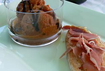 4. Ajouter de petits morceaux de jambon sur les tartines, et servir avec le Gaspacho.