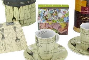 Tout d'abord, ce charmant coffret spécial pause café. Il comprend 1 coffret tasses expresso, des serviettes grises avec comme inscription "Dinner at eight", des sucres en forme de papillons et une boîte de chocolats aux amandes.