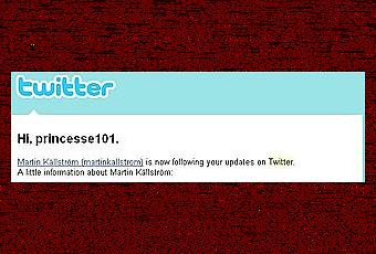 Premier exemple: il y a quelques temps, je reçois par mail une lettre d'information de la part de Twingly. L'info contenue dans la newsletter me parait sympathique, et à la fin de la newsletter, un petit bouton "twitt this". Je trouve l'idée géniale, marketingment parlant, et je clique donc sur le "twitt this". Ladite info est publiée automatiquement sur mon twitter, et quelques minutes après, le PDG de Twingly devient un de mes followers sur Twitter. Trop fort.