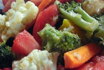 lavez bien tous vos légumes et faites de gros dés avec les tomates et les poivrons, des bâtonnets avec les carottes, les artichauts seront coupés en 4 puis citronnés et des bouquets avec la famille des choux ; ceux-ci seront rapidement cuits à la vapeur une petite dizaine de mn, tandis que carottes, tomates, poivrons et champignons resteront crus ; cuisez également légèrement les artichauts poivrades, ils n’en seront que plus goûteux ;
