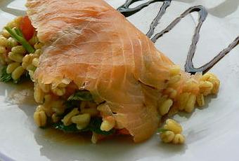 5. Dresser deux cuillères à soupe de taboulé sur les tranches de saumon fumé, rouler et servir avec une petit sauce tomate aux tomates crues (tomates pelées passées au blender avec de l'huile d'olive, du sel et du poivre).