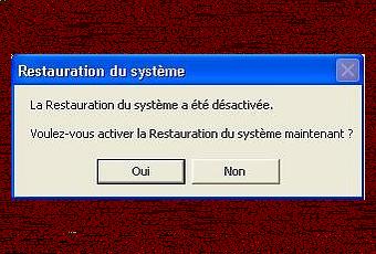 Le message ci-dessous indique que la fonction Restauration du système est désactivée.