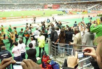 Usain Bolt lors de son tour d'honneur. Il est un aimant qui attire les photographes et suscite les cris de joie du public. (photo JCH)Je ne suis pas un spécialiste de l'athlétisme. Mais un contact amical et durable avec Bernard Amsalem, président de la fédération française d'athlétisme, m'a permis de m'améliorer dans la connaissance des performances, des spécialités, des difficultés de telle ou telle épreuve de ce sport vedette aux Jeux Olympiques. Je le remercie publiquement de m'avoir permis de découvrir, ce vendredi, les beautés d'un sport magnifique au sein duquel on cultive des valeurs nobles : l'intégration, le métissage, la lutte contre le dopage.