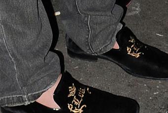 Tout le monde devrait se procurer ces superbes chaussures n’est-ce pas? Sur le coup, j’pensais que c’était les pieds de Michael Jackson, vieille photo, (RIP MJ) avouez quand même que c’était son genre de souliers. Mais non, c’est Mickey Rourke qui adopte un style un peu bizarre pour lui. En fait, c’est encore plus bizarre de savoir que ce qui est écrit sur les pantoufles souliers c’est le nom de son chien, Loki, qui est mort y’a quelques mois.