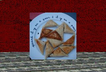 Déposez un peu de préparation sur le bout d'une lamelle de feuille de brick et pliez en faisant un triangle... au bout de votre lamelle, recommencez l'opération avec une seconde et dernière lamelle de feuille de brick