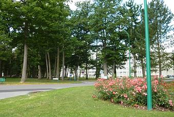 Imaginez d'abord un parc de 45 hectares, très boisé avec des arbres de plus de 100 ans. Un gazon tondu de frais, des bordures de fleurs, des bosquets de rosiers, un jardin zen, des coulées vertes permettant d'admirer les collines environnantes... Et au milieu de tout cela, 3 grands immeubles tout en longueur et d'une hauteur raisonnable. Des bâtiments blancs, clairs. On dirait 3 énormes albatros, les ailes déployées, se reposant avant de continuer leur vie ailleurs. Bref, il se dégage de l'ensemble une grande sérénité...