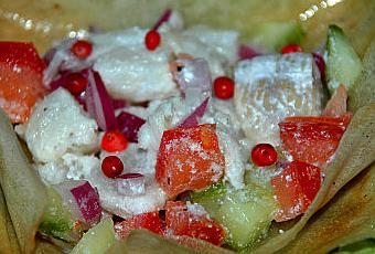 Mélanger les légumes au poisson. Disposer le tout dans les corolles en brick. Parsemer de baies roses et servir avec de la salade