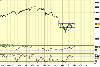 Des marchés américains sans tendance et un léger biais correctif c'est à peu près tout ce qu'on pourrait en dire. Même situation à Paris pour l'indice qui a modestement accusé le coup en clôture mais sans drame pour ce qu'il est convenu d'appeler une consolidation. La zone 3400/3425 sert pour le moment de repoussoir aux acheteurs comme nous l'avons vu et il faut donc aller voir plus bas pour se donner un peu d'élan. C'est en tous cas ce que semblent penser ces mêmes acheteurs. Notre ordre de vente placé à 3349 a été exécuté et nous sommes maintenant en position vendeur pour une taille symbolique et nous n'avons pas l'intention de la renforcer si l'indice remonte. Compte tenu de la taille réduite de cette position nous n'avons pas renouvelé de stop mais ceux qui craignent une envolée peuvent toujours en placer un à 3370/3375. Pour ce qui me concerne, je crains plutôt que l'indice ne stagne un bonne partie de la journée dans la zone 3350/3375 et ne me résoudrai à stopper cette position que sur franchissement de 3400 et , j'insiste : compte tenu de sa faible taille. Même argument pour solder cette position vendeuse dans la zone 3300 car nous avons déjà une condition survendue en très court terme. Le plus long terme n'a pas changé et ce n'est qu'au dessous de 3260 que les choses basculeraient dans le vide alors qu'au dessus de 3425 les tenants de la hausse pavoiseraient. Les abonnés recevront des updates et des alertes. Bons trades !
