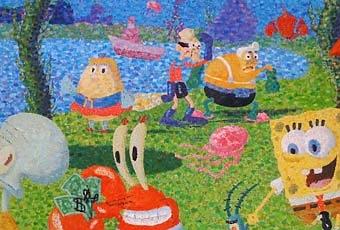 Plongée dans l'Histoire de l'art pour les tout-petits à travers le personnage loufoque de Bob l'éponge qui s'invite au musée... c'est ce que propose le Pavillon de l'eau à Paris, jusqu'au 21 novembre. L'occasion ? Les 10 ans de Bob l'éponge le dessin animé imaginé par le réalisateur américain Stephen Hillenburg, également biologiste marin. Tout de jaune vêtu, une pêche d'enfer, Bob détourne et s'incruste dans des œuvres de grands artistes, Van Gogh, De Vinci, Magritte... ou ici Georges Seurat (1856-1891) dans "Un Dimanche après-midi à l'ïle de la Grande Jatte". L'expo est parrainée par le WWF, et pour cause ! Voici le moyen de sensibiliser les enfants à l'eau douce, la mer (dans laquelle vit Bob), et la préservation de l'environnement.