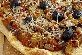 Préparer la pâte à pizza selon la recette habituelle. Il s'agit en fait d'une pâte à focaccia, bien plus moelleuse qu'une pâte à pizza ordinaire. L'étaler finement au rouleau entre 2 feuilles de papier sulfurisé. Y déposer la ratatouille, en couche fine mais bien serrée. Ajouter quelques olives noires, parsemer de fromage râpé. Faire cuire au four, thermostat 5 (four à gaz), ou 6 (four électrique), 10 mn seulement car la pâte cuit très vite : elle doit rester moelleuse et durcir à peine sur les bords.