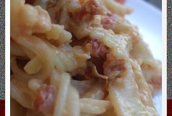 Il me restait des jaunes d'oeufs après avoir réalisé les palets citron framboise d'Eryn. Quelle meilleure excuse aurais-pu trouver pour improviser des carbo à ma façon, ou du moins selon l'inspiration du moment ? Donc ici, point de lardons, mais des tomates séchées, d'où la couleur un peu rouge de cette sauce. Fameuse la sauce ainsi détournée ! J'ai accompagné ces pâtes d'une bonne salade ... de tomates bien-sur.