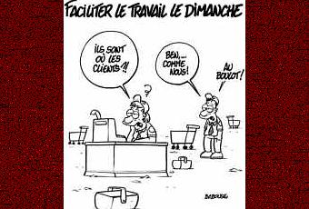 Les Députés et Sénateurs UMP et Nouveau Centre ont adopté la semaine dernière la loi permettant aux commerces et grandes surfaces d'ouvrir le dimanche! Une loi fortement contestée par le Parti Socialiste et les partis de gauche en général! Le gouvernement a mis cela en place pour soit disant relancer la croissance et permettre aux français de consommer encore plus. Une nouvelle fois c'est un mauvais coup qui est porté au code du travail et aux acquis sociaux.