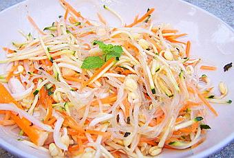 Ajoutez dans le saladier les vermicelles, les courgettes, les carottes, les germes de soja et les crevettes. Mélangez à nouveau. Lavez les feuilles de menthe et coupez-les finement.