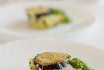 Parmigiana di melanzane bianca con scamorza affumicata e pesto di rucola (per 4 persone)